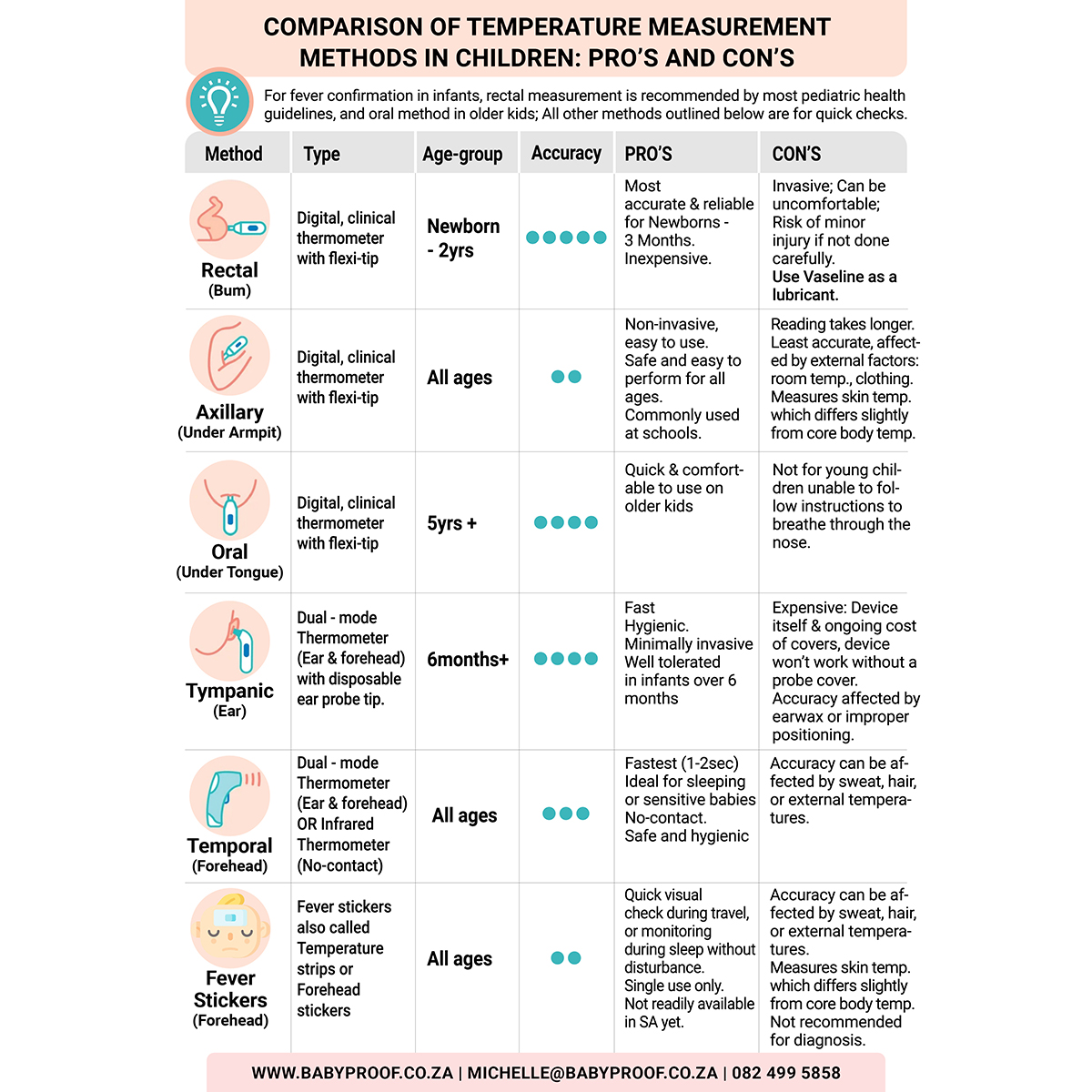 If you are not sure which method to use below, scroll further down to the heading: Best Method to measure body temperature by Age Group; for a quick guide on the most suitable method for your childs age.